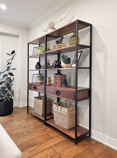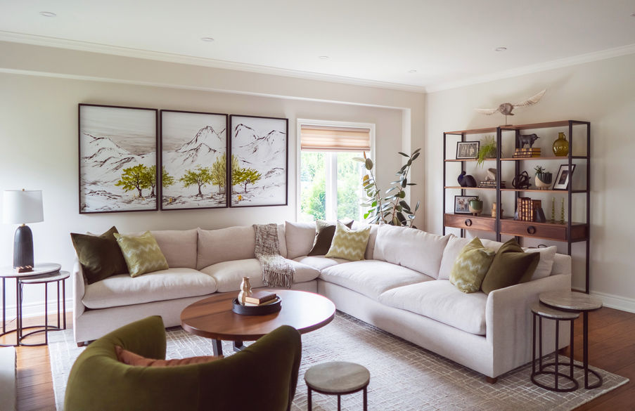 Our clients purchased a traditional two-storey home on a beautiful property, just minutes away from the beaches of Lake Erie. They fell in love with the location and the lush double-wide lot, and wanted to make this the home that they eventually retire in. Though the home had plenty of square footage, our clients came to us because they were having difficulties furnishing the main floor in a way that was conducive to entertaining and suited their modern style, plus they were looking for ways to better enjoy the outdoors for longer than our short Ontario summer season. We strategically designed an addition to the home that included a formal dining room and a large 3-season enclosed patio, and maximized the natural light and views of the property. The combination of indoor and semi-outdoor space was seamlessly integrated into the existing home with a paneled design that complemented the existing finishes, and large windows that bring the outdoors in. The enclosed patio includes large screens for warmer days, and a gas fireplace to extend it's use into the cooler seasons. The entire main floor was refreshed with new custom furnishings and a fresh colour palette of light neutrals, warm wood and nature-inspired greens. The wood kitchen cabinetry was preserved, but we added a new large island, reusing the previous island cabinets as a new coffee station adjacent to the dining room. Overall, we were able to drastically improve the flow of the home, balance modern elements with the traditional architecture, and create a space that is optimized for entertaining and enjoying the outdoors.
